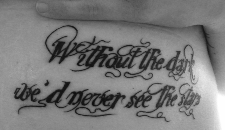 Owners Description: LaShonda: "What's the significance of this quote? All of my tattoos are really important to me. They are a huge part of me as a person. My tattoo says, "You are the most important thing to me now. The most important ever." It's not word for word from the book. In the book it says, "You are the most important thing to me now. The most important thing to me ever." Edward said this to Bella in the meadow! It's him telling her how much he loves her and it just hit me and has always stayed with me. It's really about love in general; Edward just so happened to be saying it! I'm also at a point in my life where I'm happy and in love, so that probably played a part too. What have people said about your tattoo? Most of my close circle of friends have already read the books. They all know I love Edward. They all know it's from the book, but most people don't. Most people just like what it says. I tell people it's from a book and if they ask which one, I tell them I'm a Twihard"
